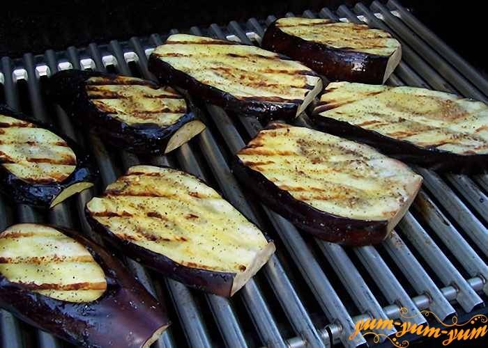 Ломтики баклажанов запечь на гриле с обеих сторон до золотистого цвета.