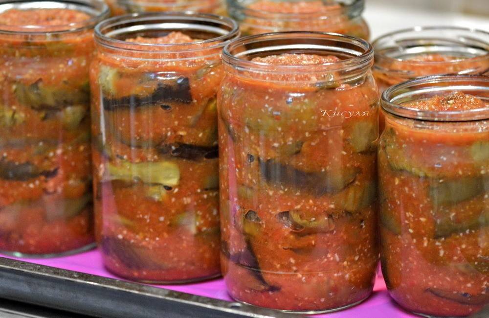 Порезанные баклажаны обжаривают. Нашинкованные в форме соломки перец и кольцами лук соединяют с синенькими, тушат до готовности. В конце добавляют оставшиеся ингредиенты, после тщательного перемешивания отправляют для стерилизации на 10 минут.