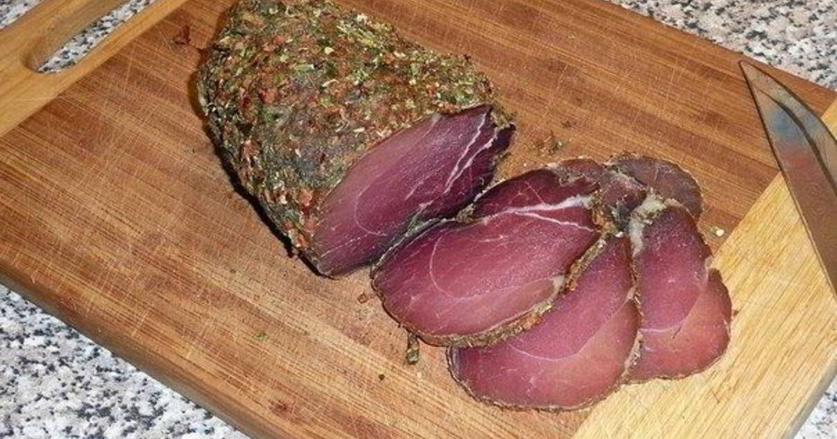 - Обсушенные куски мяса обвалять в этой смеси, уложить рядами в подходящую емкость и мариновать в течение 4 суток. Этот процесс следует повторить дважды-трижды, после чего куски мяса просушить подвешенными на воздухе в течение 10 суток.