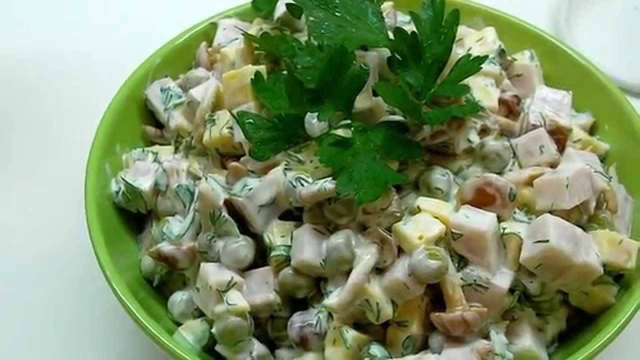 Если в семье много взрослых и сильных мужчин, то легкий салат в классическом виде тут не подойдет. Предлагаем дополнить блюдо любимым отварным картофелем и зеленым горошком.