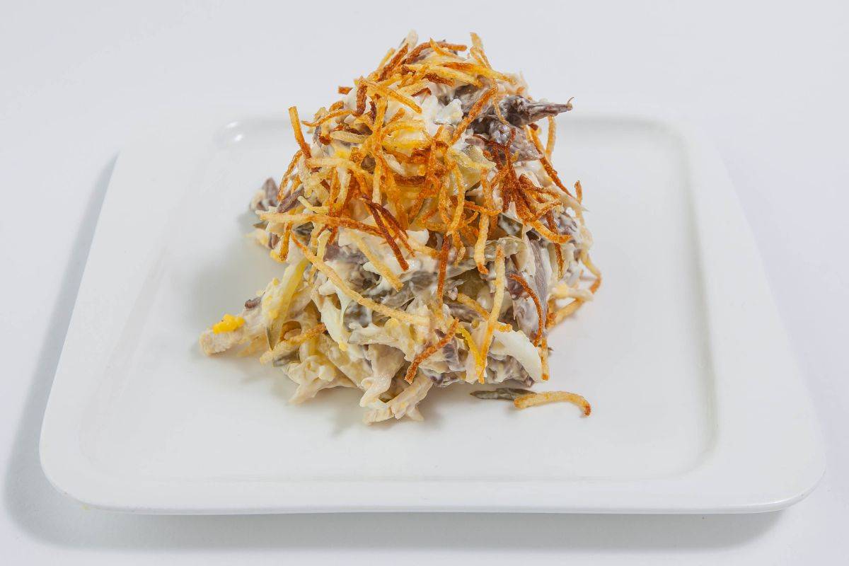 Подавать салат следует спустя 20-30 мин. с момента его приготовления. Это поможет основным ингредиентам пропитаться майонезной или сметанной заправкой, стать мягче и раскрыть свой вкус. В качестве украшения в данном случае уместно использовать маслины или оливки, а также свежие помидоры или огурцы, нарезанные в необычные фигуры (например, из тонких слайсов огурца можно составить бутон цветка, в центре которого положить маслину).