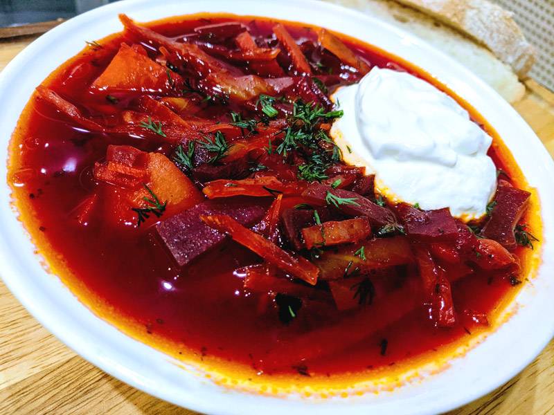 Добавьте в конце варки натертую вареную свеклу – так он станет багровым.