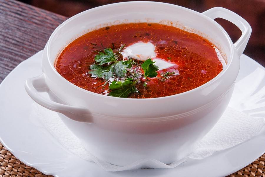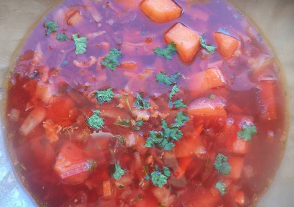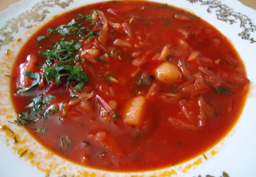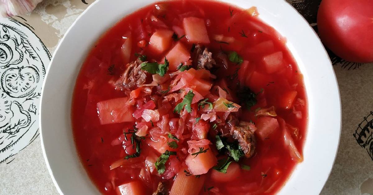 Тебе понадобится: 1,5 кг говядины на кости, 3,5 л воды, 2 луковицы, 3 моркови, 1 корень петрушки, 2 свеклы, 3 лавровых листа, 3 картофелины, 3 ст.л. яблочного уксуса, 3 помидора, 0,5 ч.л. сахара, 500 г капусты, 5 зубчиков чеснока, специи.