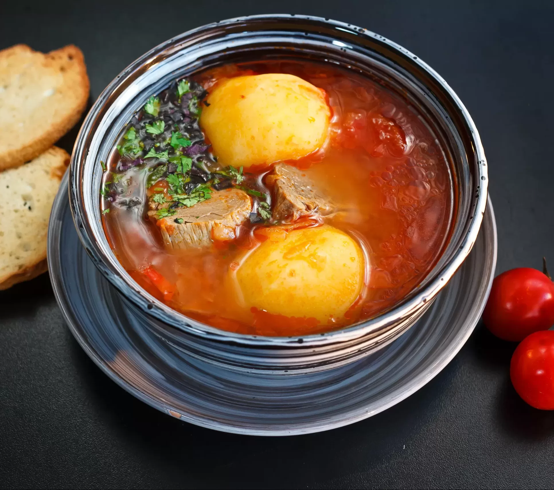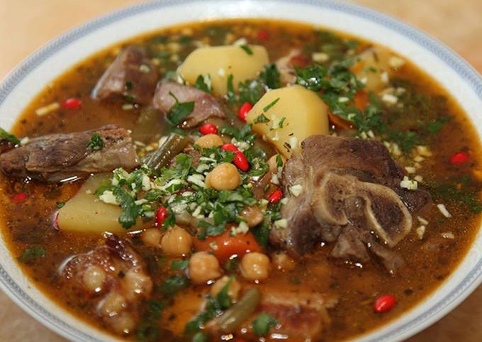 Количество мяса и воды в разных рецептах супа практически одинаково, разница заключается в используемых овощах и фруктах и наборе пряных трав. Технологическая схема приготовления практически одинакова – сначала отвариваем мясо, затем в крепкий бульон из баранины добавляем обжаренные на масле овощи и специи (базилик, эстрагон, мяту, шафран). Отваренная и промытая баранина может дополнительно обжариваться.