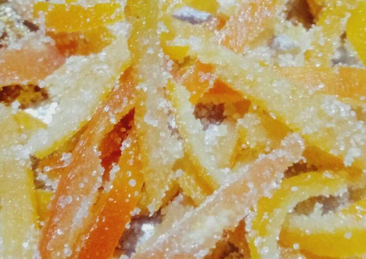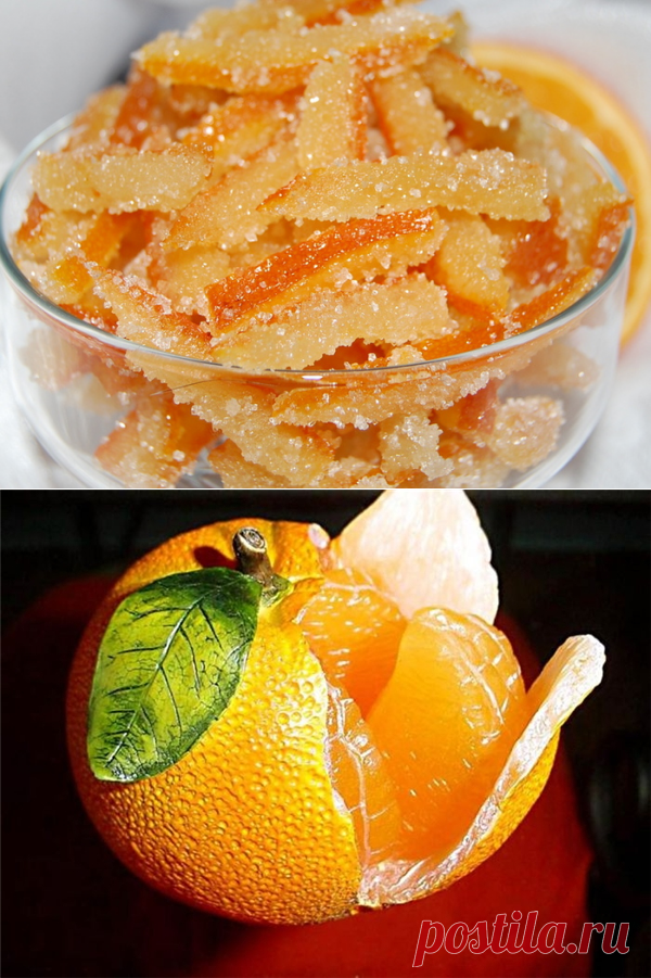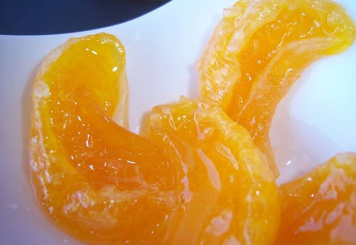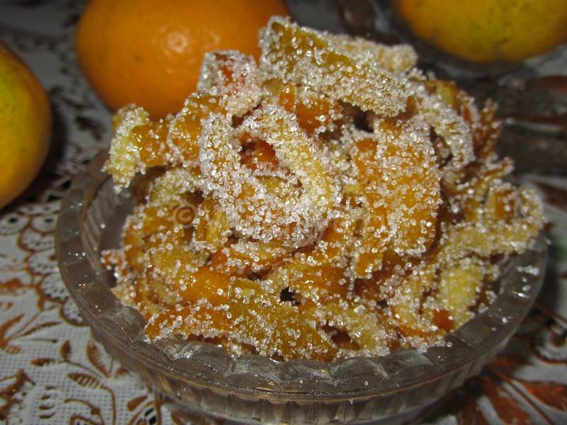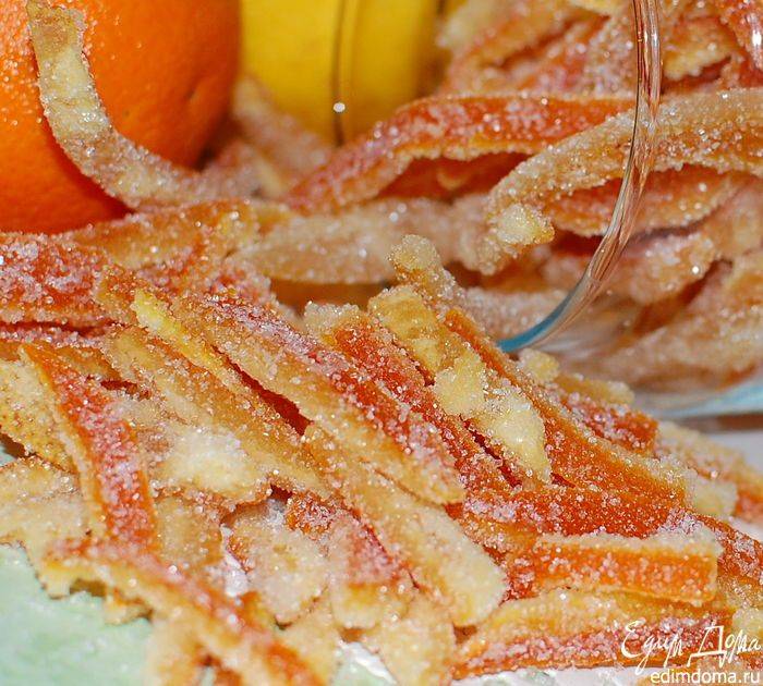 Кожуру из мандарина засахаривают отдельно или сочетают ее с лимонной, грейпфрутовой, апельсиновой цедрой.