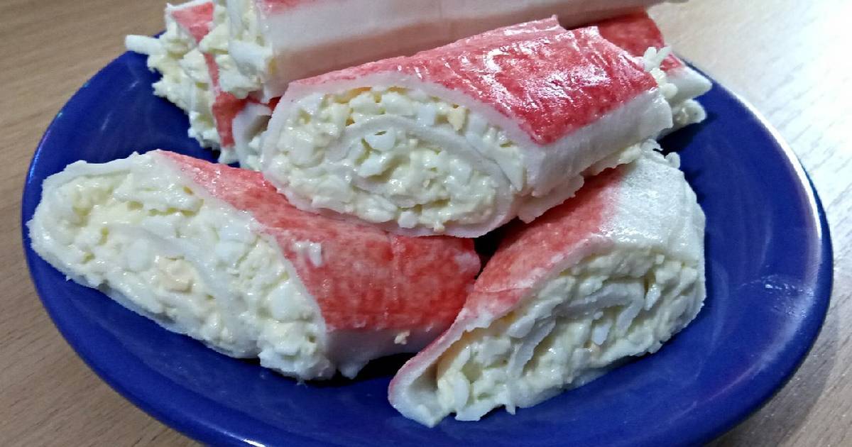 - Развернуть, и дополнить крабовые палочки начинкой. С той же аккуратностью закрутить, разрезать на половинки.