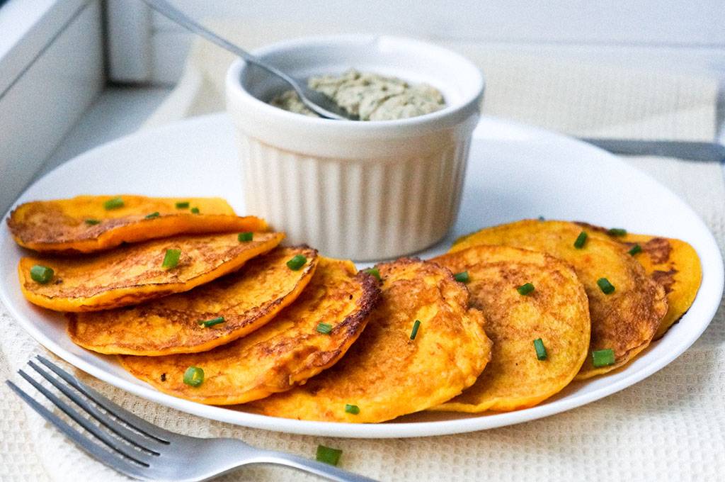 Такое блюдо хорошо подавать с овощами. С данного количества ингредиентов получается около 20 оладий. Приготовление займёт примерно 40-45 минут. Предложенный вариант приготовления оладий из гороховой муки подходит для вегетарианского питания, так как не содержит в составе продуктов животного происхождения.