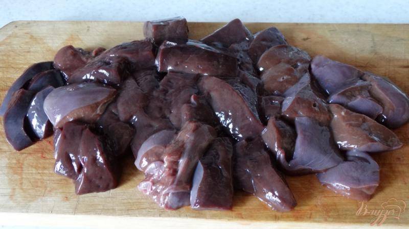 Шаг 1. Промываем печень и отделяем все лишние части, прожилки и пленку. Не забываем просушить субпродукт при помощи салфетки и нарезать на среднего размера кусочки.