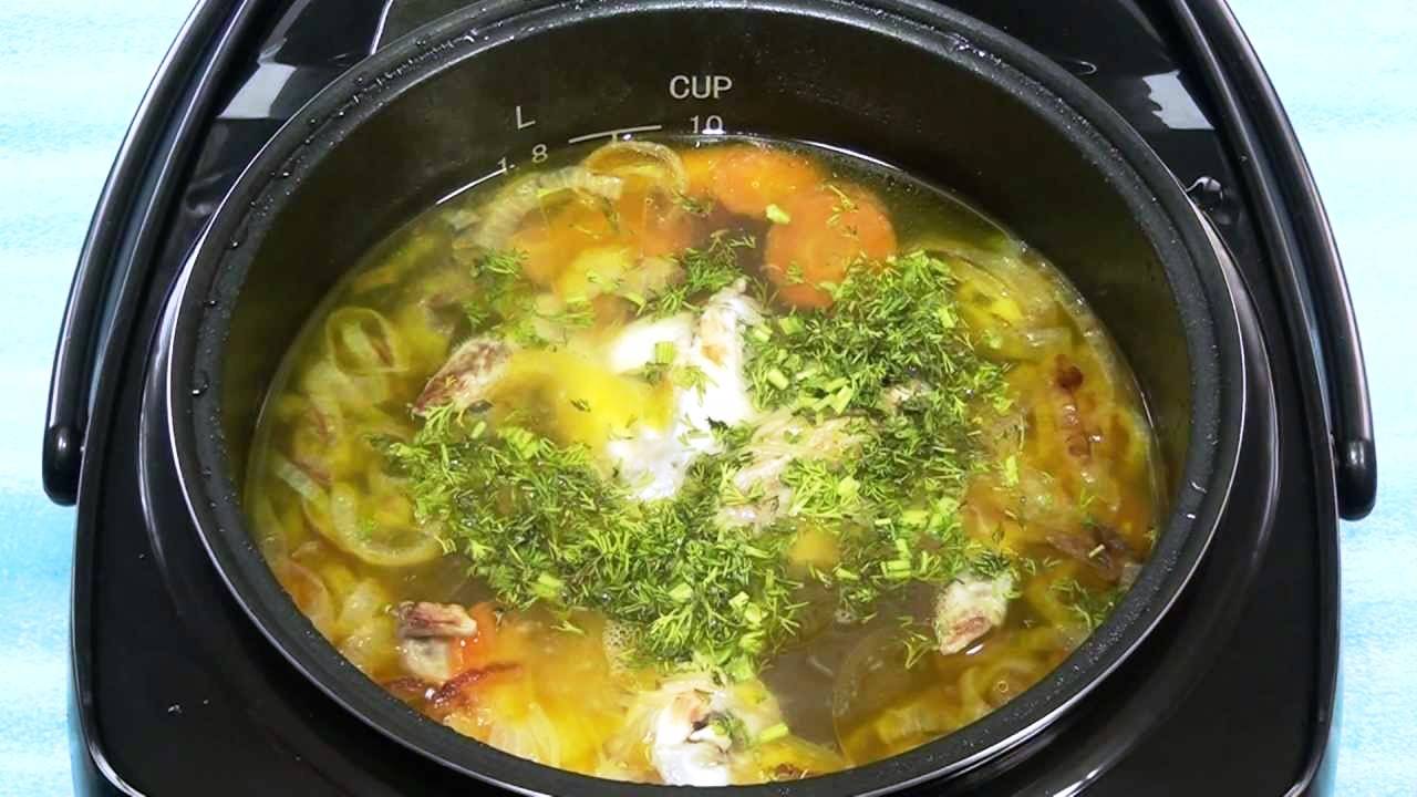 Готовый суп оставьте в мультиварке на 10-15 минут, чтобы он настоялся. Это подходящий момент, чтобы заправить его мелко нарезанной зеленью.