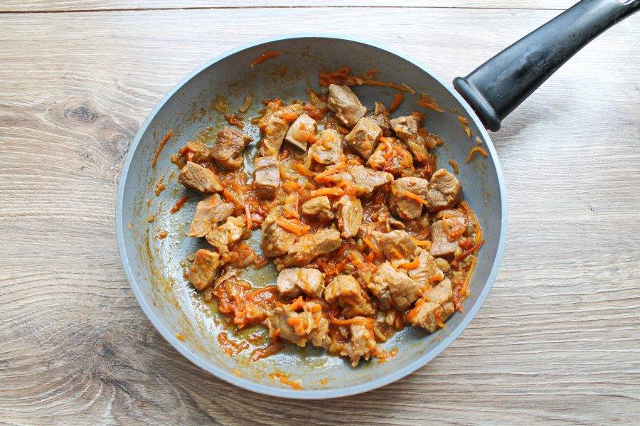 - Добавить 1,5 ст. л. томатной пасты, немного обжарить.