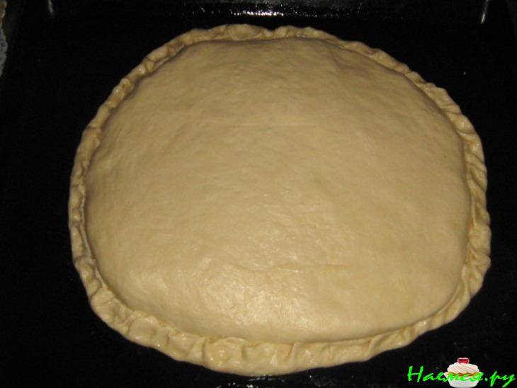 Выкатать пласт для низа пирога, начинить. Выкатать пласт для верха пирога, накрыть, защипнуть. Дать пирогу 20-40мин расстойки.