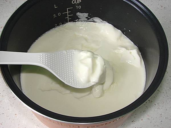 - Литр кипяченого остывшего молока заливаем в мультикастрюлю, добавляем Активию (150 мл), все тщательно перемешиваем.