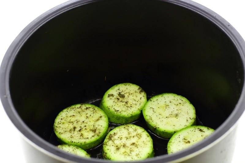 1.Нарежьте вымытые кабачки на кружочки, толщиною около 1 см. Сложите в миску, посолите и поперчите по вкусу. Также для аромата можете добавить немного тимьяна или другие травы. Перемешайте и пока отставьте в сторону.