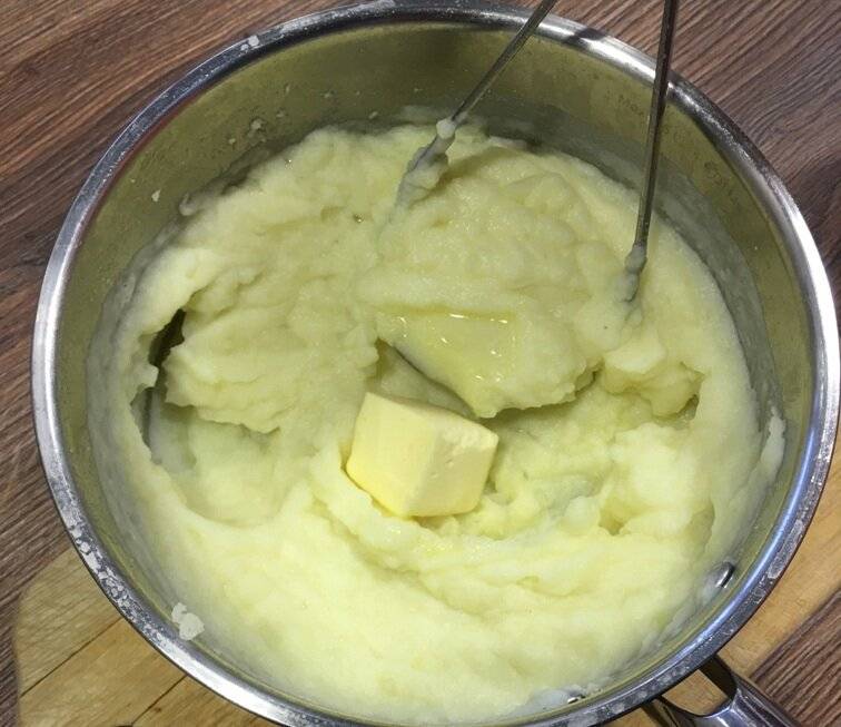 - Картофелемялкой размягчите картошку, добавьте сливочное масло и снова хорошо разомните.
