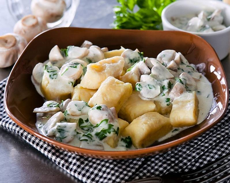 Получившееся лакомство вкусно пробовать именно теплым или горячим. Нужно разложить ньеки по порционным тарелкам вместе с соусом из креветок и сливок. В итоге получится оригинальное блюдо, которое можно подавать даже к праздничному ужину. Чтобы сделать его еще аппетитнее и привлекательнее, стоит использовать овощи и зелень. Например, выложить сверху половинки черри, листочки петрушки, мяты.
