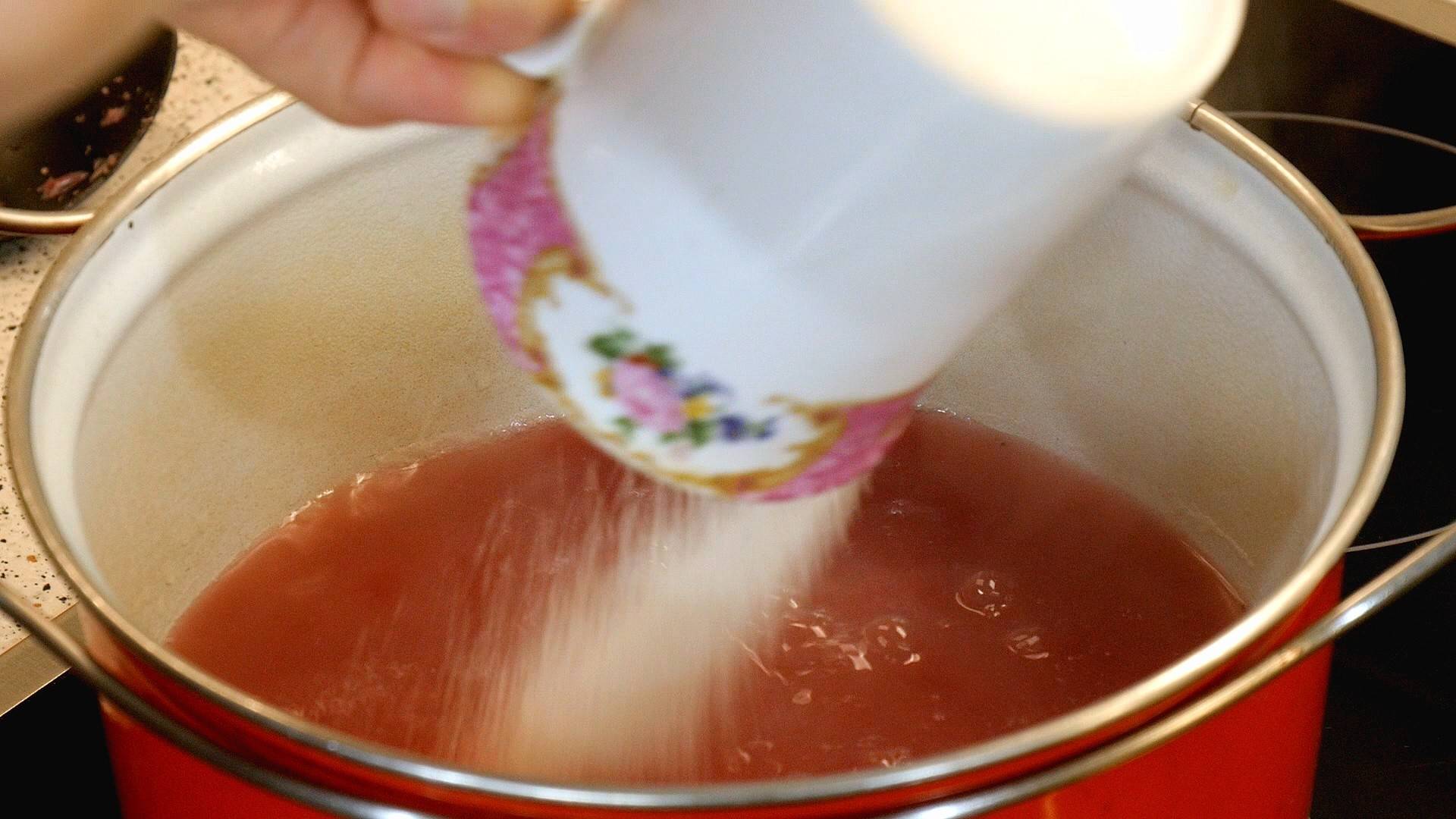 - Вода с добавленным вареньем ставится на огонь и доводится до кипения.