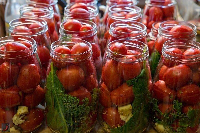 - Вымытые помидоры прокалите зубочисткой и выложите в банки, перемешивая со всеми продуктами. Встряхните банки для лучшей комплектации пространства.
