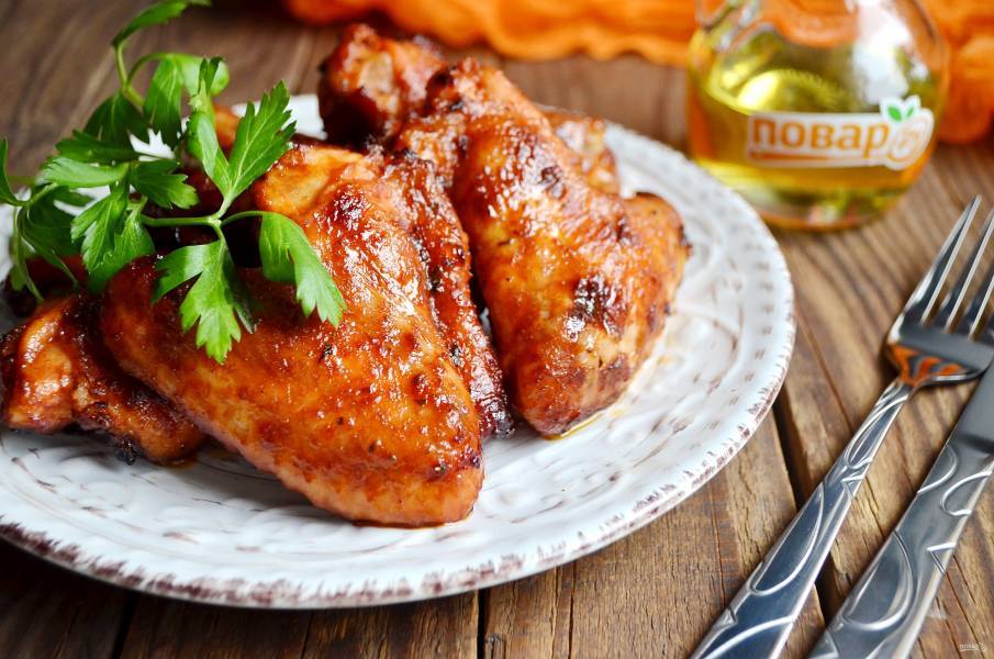 Самый удачный и простой маринад для крылышек — мёд с чесноком в компании с кетчупом. Но здесь следует напомнить, что птица в сладком маринаде может быстро подгореть. Поэтому в процессе жарки смазывайте крылышки соусом, тогда они получатся с красивой румяной и хрустящей корочкой снаружи, нежным и сочным мясом внутри.