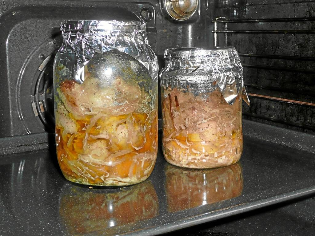 Накройте банки фольгой или прикройте крышкой. Поставьте банки в холодную духовую печь и только после этого включайте духовую печь. Курица будет готова через 45 мин. Важный совет: ставьте ёмкости с мясом на противень, чтобы не испачкать духовую печь. Это нужно делать из–за того, что во время приготовления сок курицы может вытекать из банок и капать.