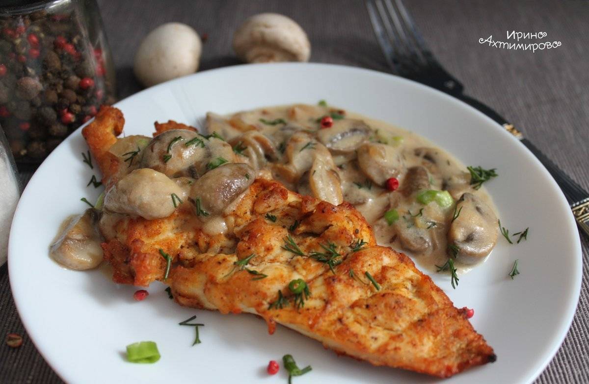 Филе курицы с шампиньонами и чесноком в сметане