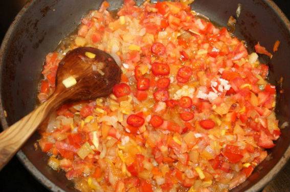 13. Затем добавить томатную пасту вместе с сахаром и обжарить все вместе еще 3 — 4 минуты.