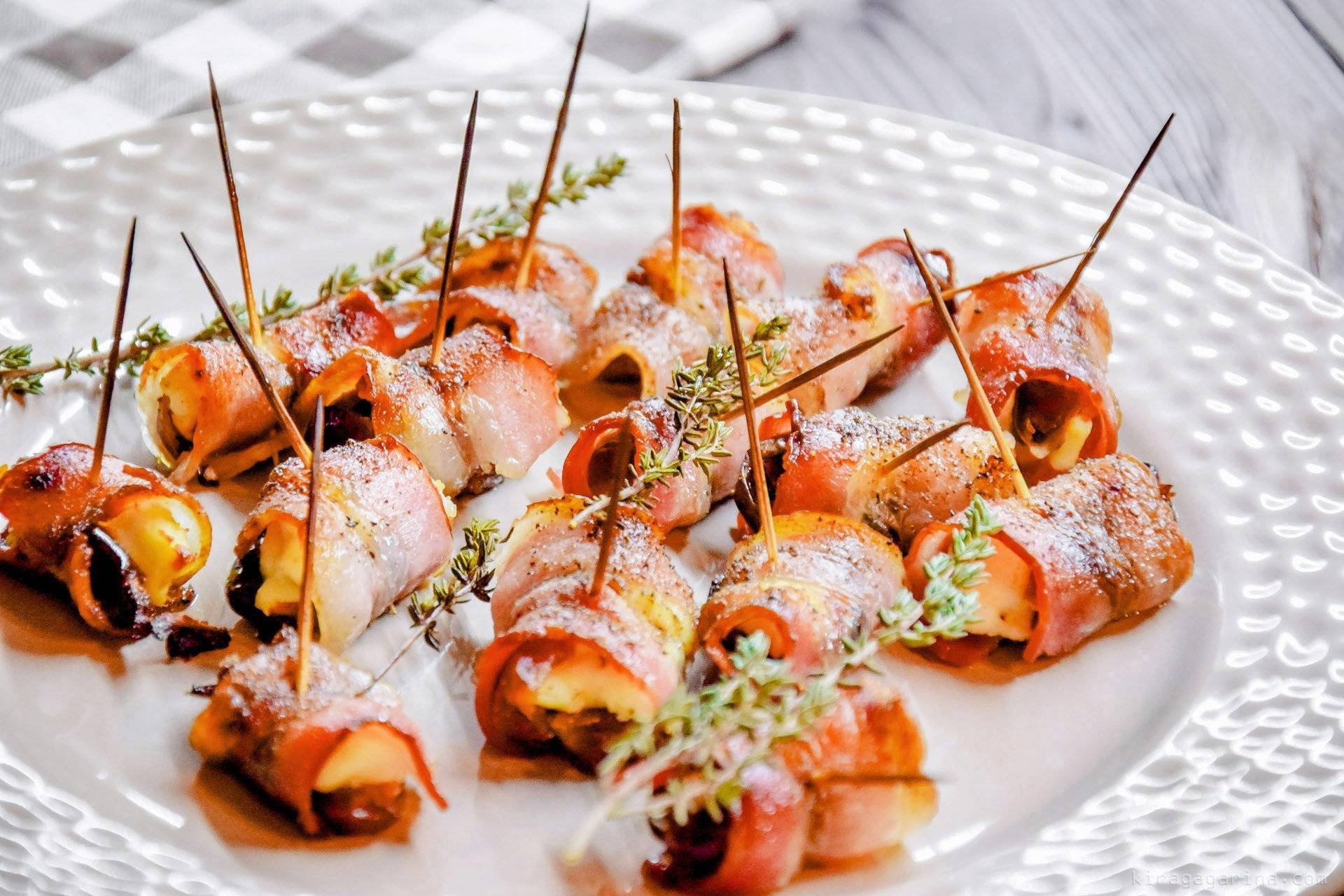 Закуска из фарша, сыра и маслин в беконе