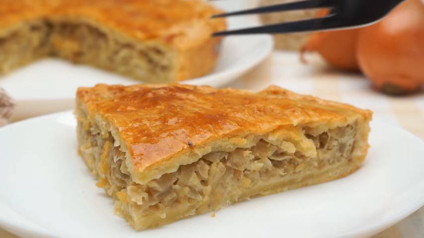 Положите на тесто начинку. Накройте вторым пластом и защиплите края. Духовой шкаф нагрейте до 200 градусов. Выпекайте луковый пирог 15-20 минут до золотистого цвета.
