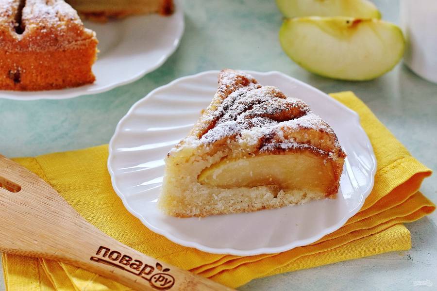 Рецептура яблочного манника, в который кроме крупы добавляется пшеничная мука. Этот прием делает тесто мягким, больше похожим на шарлотку. Жиры в тесто не используются.
