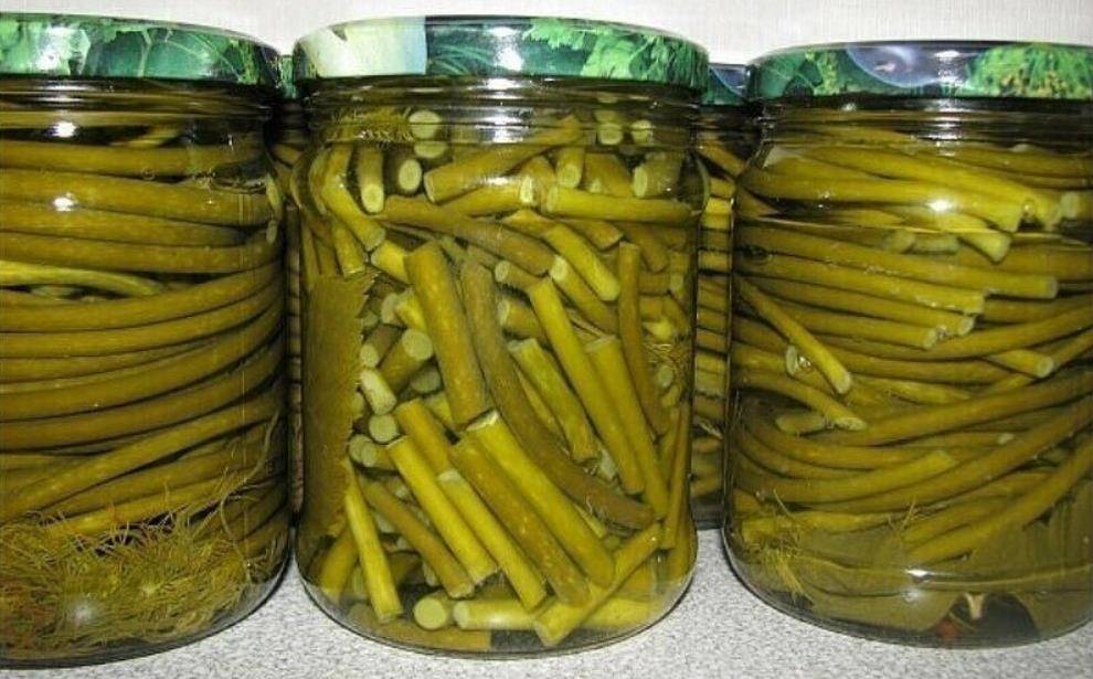 - В последнюю очередь кладутся маринованные чесночные стрелки (200–300 г).