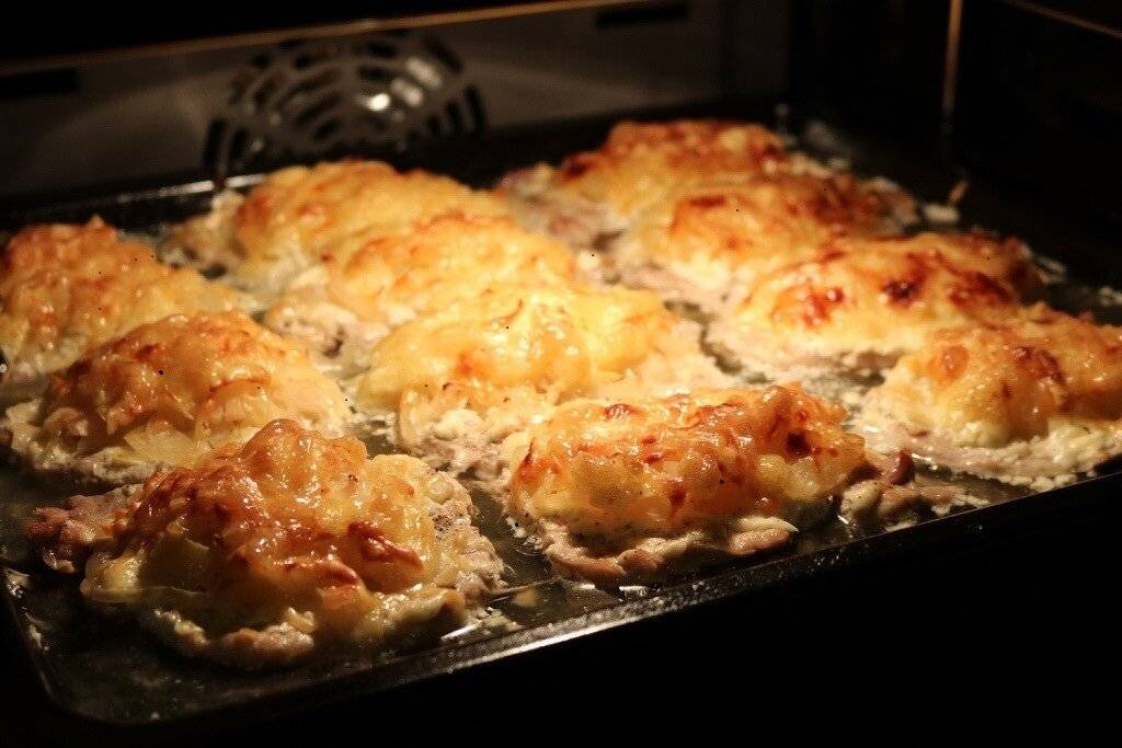 Это самый скромный вариант мяса по-французски, без овощей. Шуба здесь будет не пышная, но блюдо все равно получится сочным. Зато соус включает в себя не только майонез, но и другие продукты. Получится довольно интересный вкус.