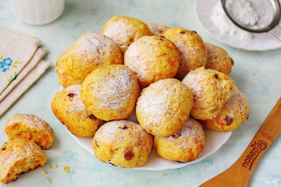 Приготовление окончено! Такое нежное печенье лучше всего просто посыпать сахарной пудрой, а уж во время чаепития добавить к ним самые любимые гарниры типа тягучего меда, орехов, варенья – к примеру, моя дочка обожает кушать морковное печенье с медом и овсяной кашей. Также такая выпечка отлично идет с яблочными, грушевыми или сливовыми компотами и клюквенным морсом. Кушать морковное печенье лучше всего тепленьким, так как в таком виде оно просто тает во рту и приятно насыщает во время полуденного перекуса, а вот на следующий день изделия уже могут немного зачерстветь.