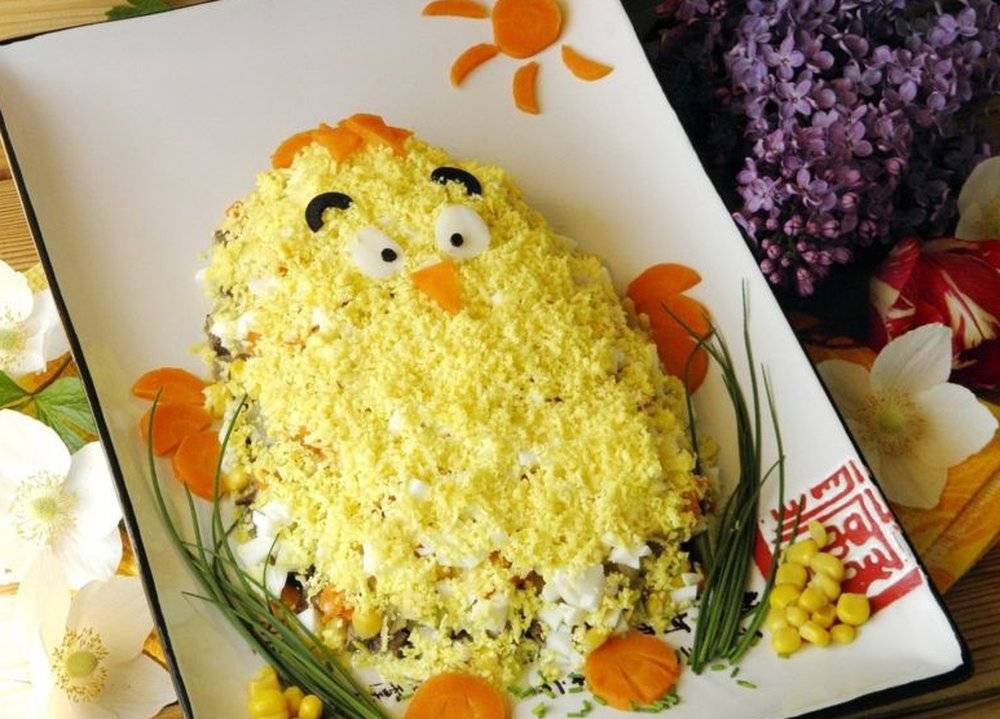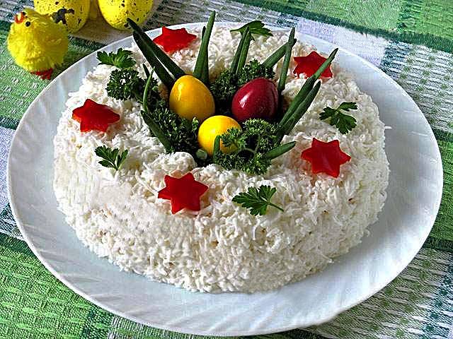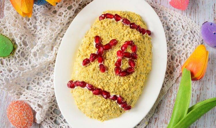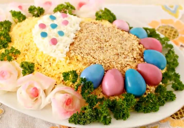 Главным достоинством этого салата является его внешний вид – он станет настоящим украшением пасхального стола.