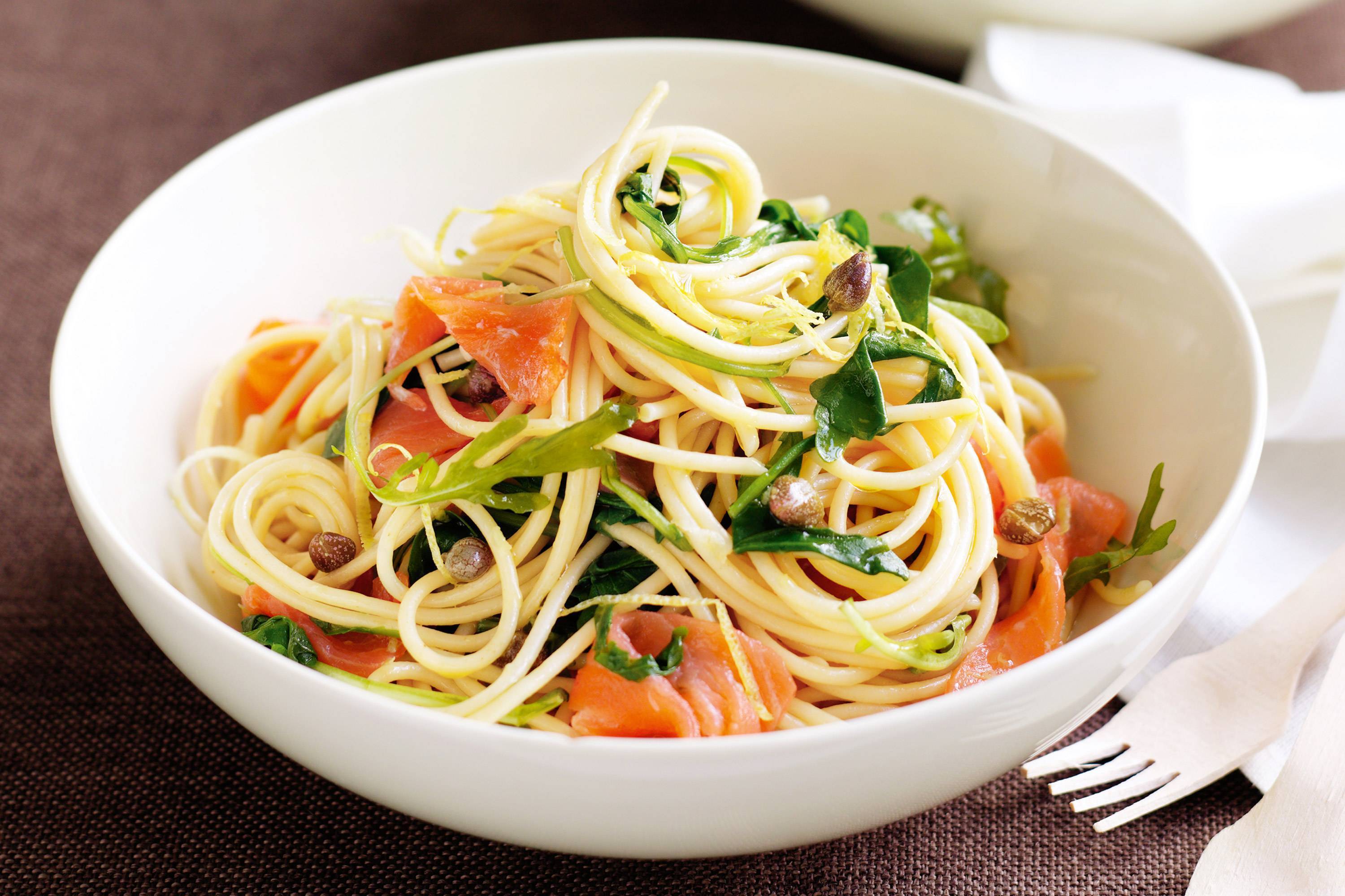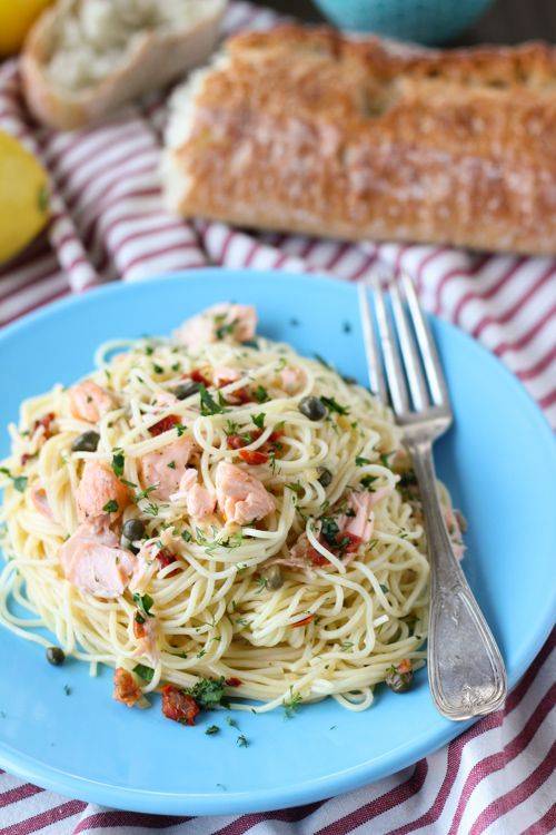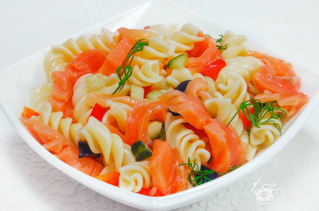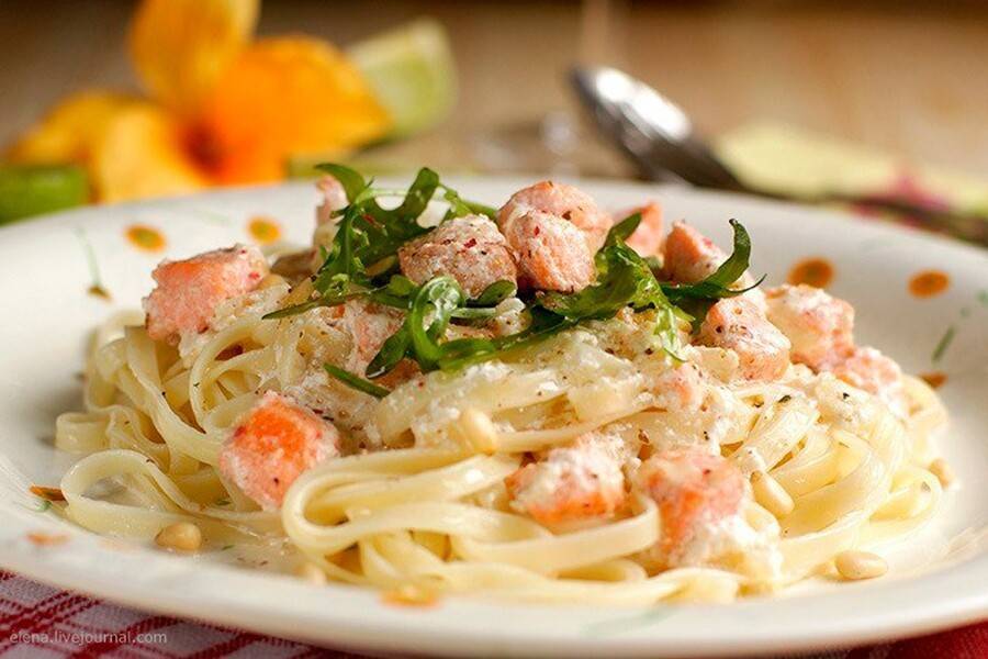 - Пропеченный лосось шинкуем соломкой и выкладываем ее сверху на соус с пастой.