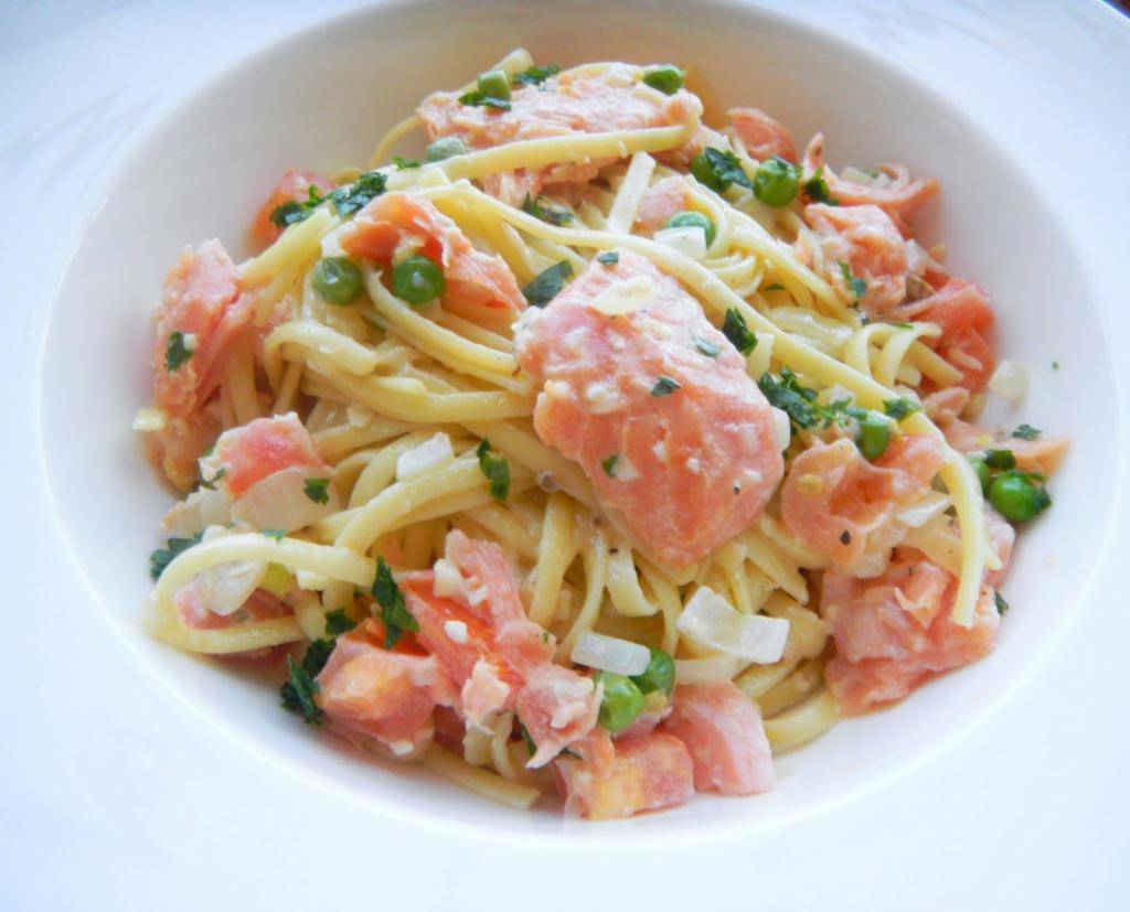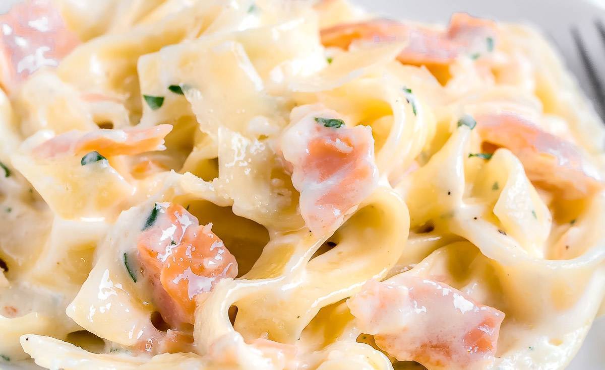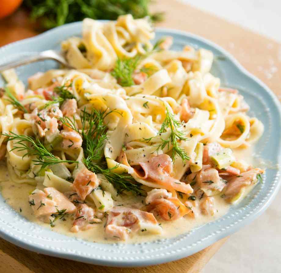 Теперь отправляем в готовый соус отваренную пасту, хорошо их перемешиваем, выдерживаем на среднем огне еще минуту, чтобы кушанье прогрелось, снимаем с плиты и даем отдохнуть 3 минуты. После этого раскладываем феттучини с семгой порциями по тарелкам и сразу сервируем к столу.