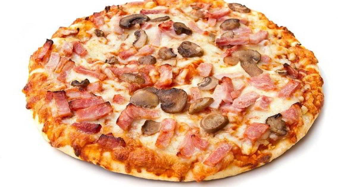 Пицца с салями, бужениной и маринованными шампиньонами.