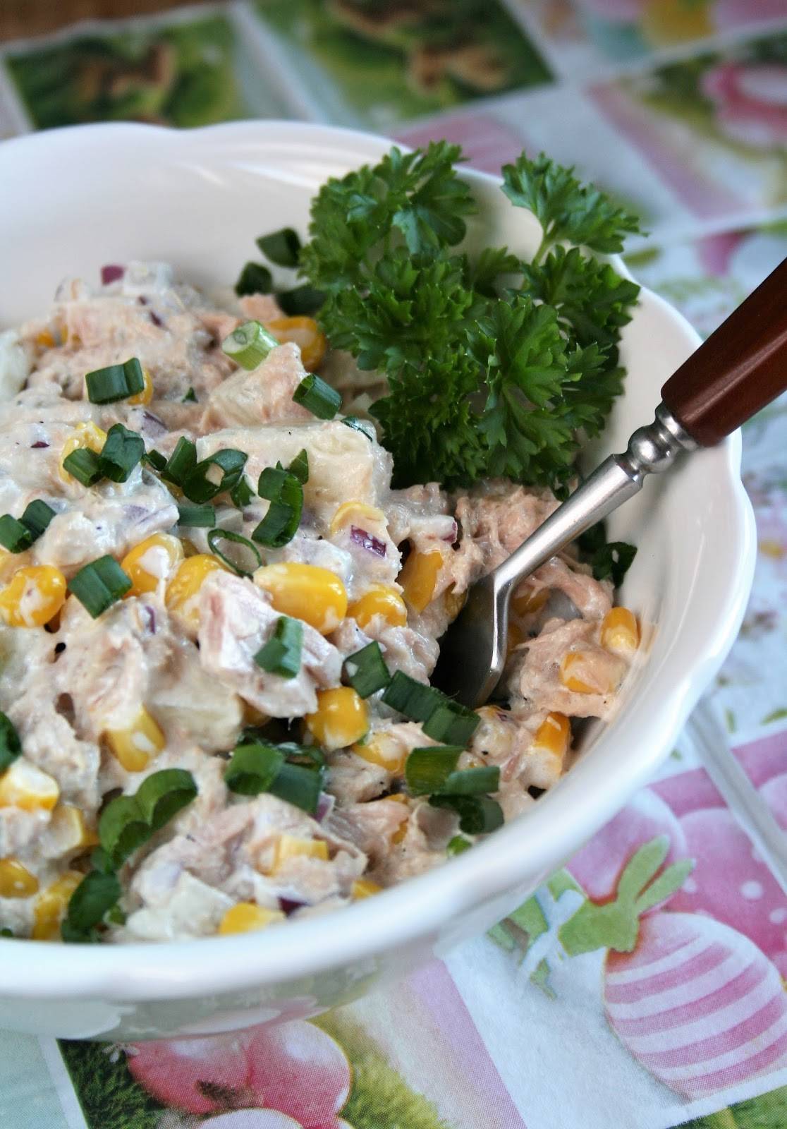 1. Все ингредиенты нарезаем не крупными кубиками, а капусту шинкуем соломкой. Соединяем все вместе в салатнице. Добавляем кукурузу. Перемешиваем.