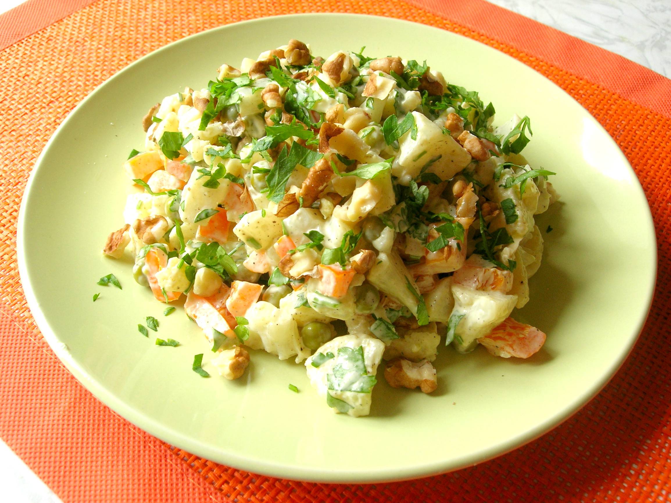 Традиционно русский салат, как многие считают, но это не совсем так, корни его зачастую находят и в Швеции, и в Германии и даже во Франции. Но не будем вдаваться в историю, наша задача как можно быстрее накормить наших домочадцев. Если вы заранее запланировали этот салатик или у вас остались вареные овощи, тогда это идеальный варинт для приготовления салата на скорую руку. Вам будет необходимо лишь нарезать и смешать все ингредиенты.