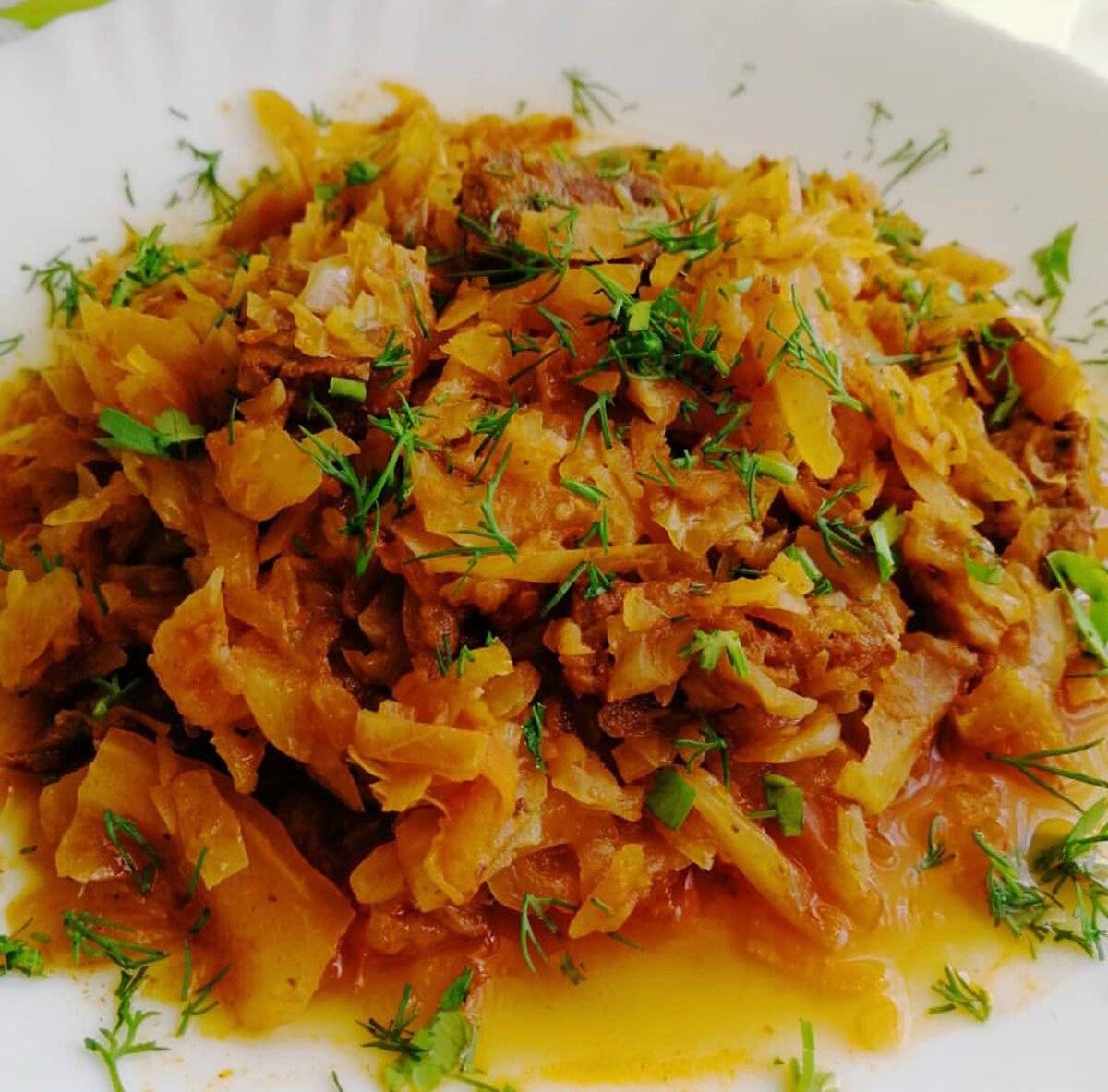 Капусту нашинковать и обжарить с луком и морковь. Добавить специи и соединить с томатной пастой. Тушить до готовности.