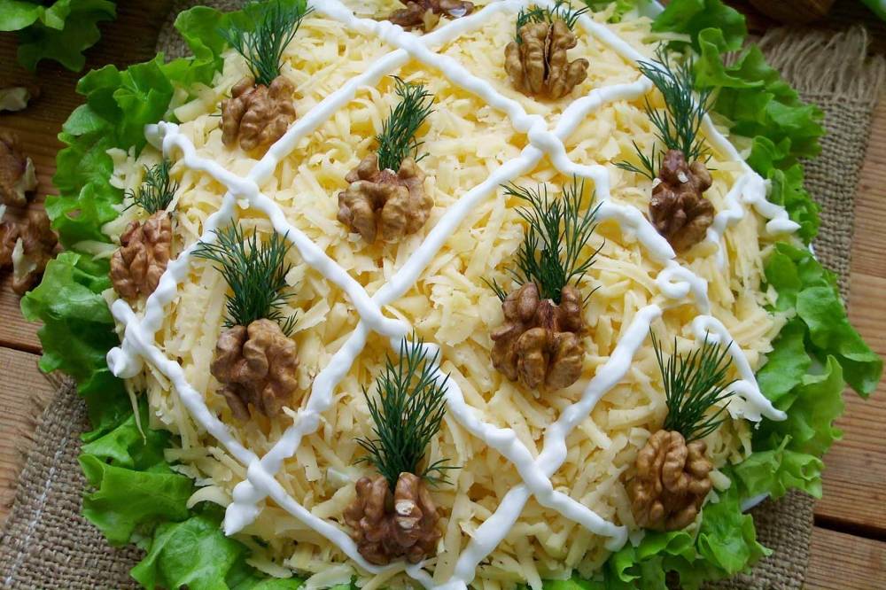 - Верхний слой салата должен состоять из сыра, его не смазывайте майонезом.