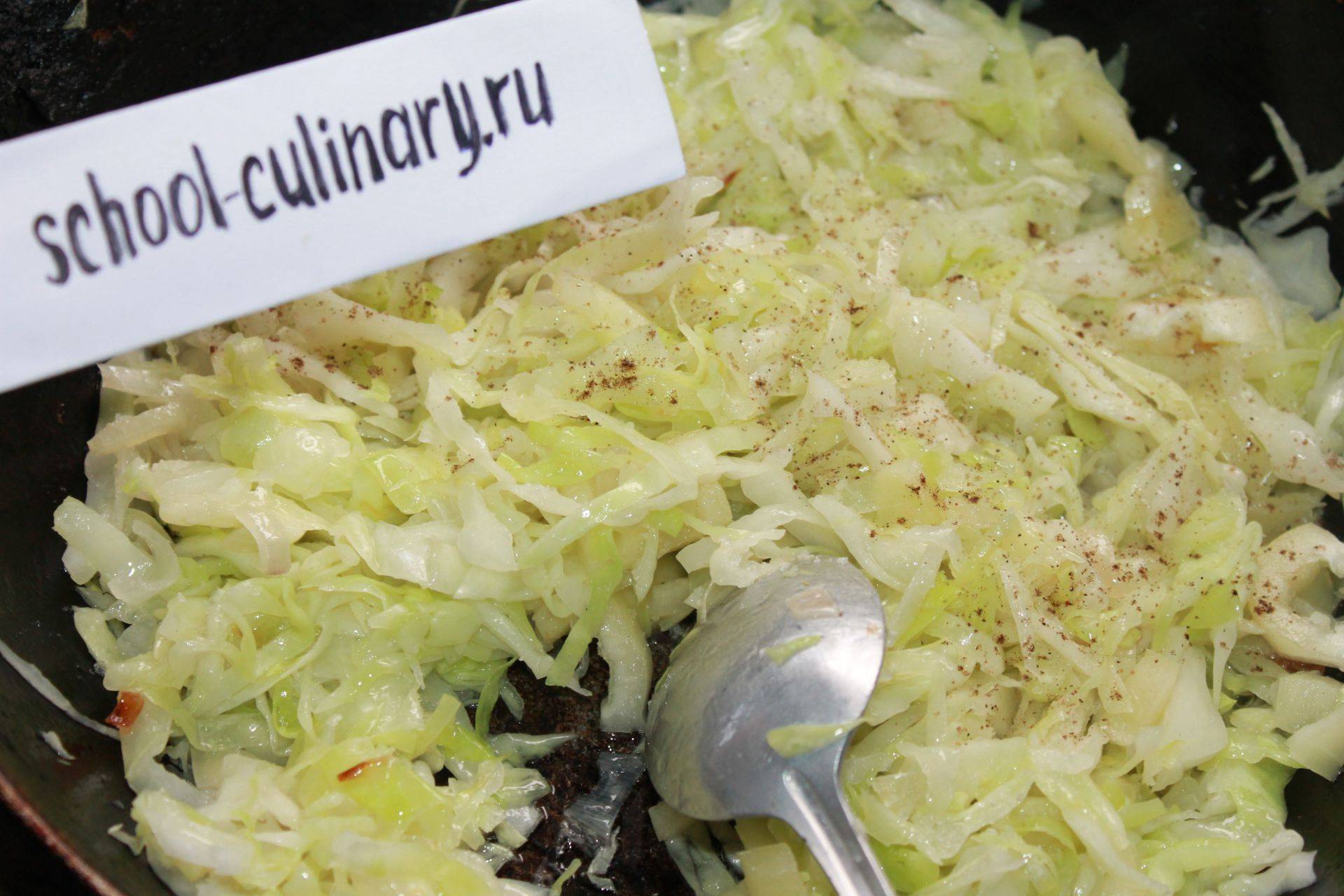 - Когда фарш практически готов, всыпаем нашинкованную капусту, готовим до мягкости овощей.