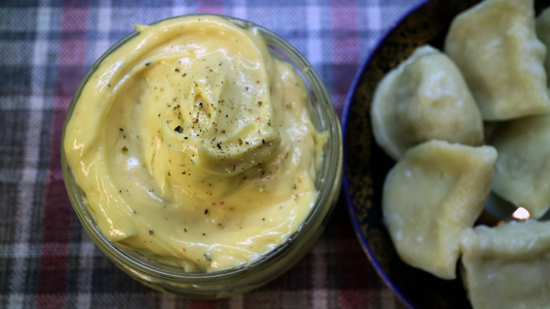 Его можно подать к холодным мясным или рыбным блюдам. Подать к мантам и пельменям. Или, например, кушать с овощами.