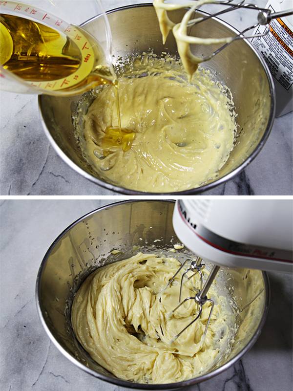 - Тонкой струйкой влить оливковое масло, повторить процесс взбивания.