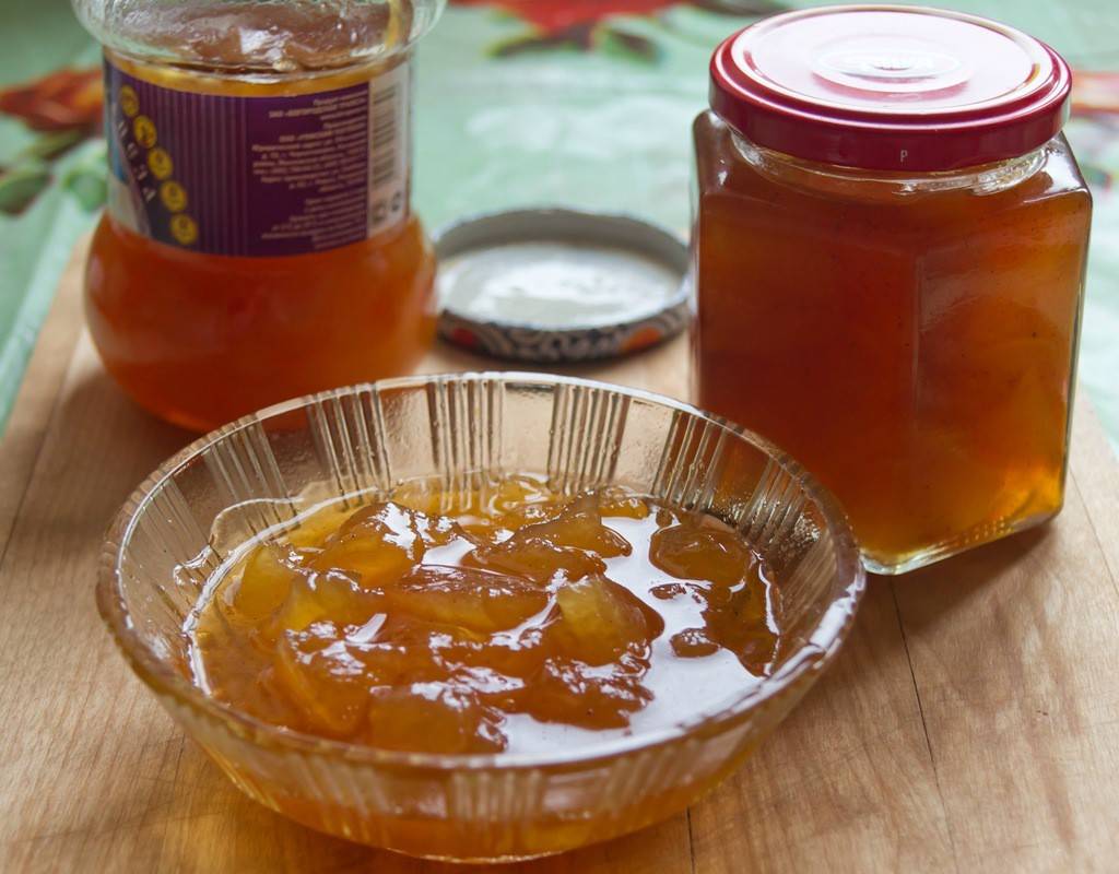 Основной продукт нарезать крупными кубиками и сложить в кастрюлю. Налить воду, вскипятить и варить пару минут. Фрукты достать, а в оставшуюся жидкость добавить сахар. Томить на медленном огне 5 минут. Затем вернуть плоды в сахарный сироп и проварить еще несколько минут. Залить варенье в сухую банку и закрыть плотной крышкой или закатать.