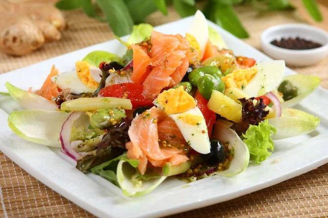 Если вы всерьез настроены устроить пышное застолье на Новый год, без салатов с красной рыбой не обойтись. Их главным компонентом может быть изысканная семга или более доступный вариант – горбуша собственного посола. Здесь не нужен майонез, ведь мы собираемся показать вкус рыбы «во всей красе».