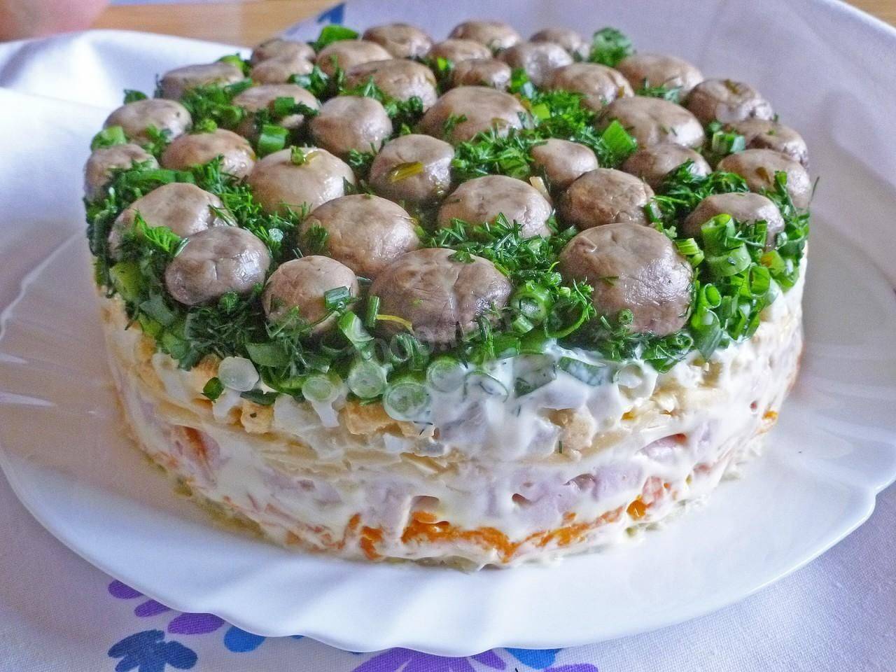 Классический вариант можно чуточку изменить. Например, заменить шампиньон на любые другие грибочки. А ещё в салате прекрасно сочетается мелко порезанная колбаска, домашняя тушёнка и даже консервы из рыбы.