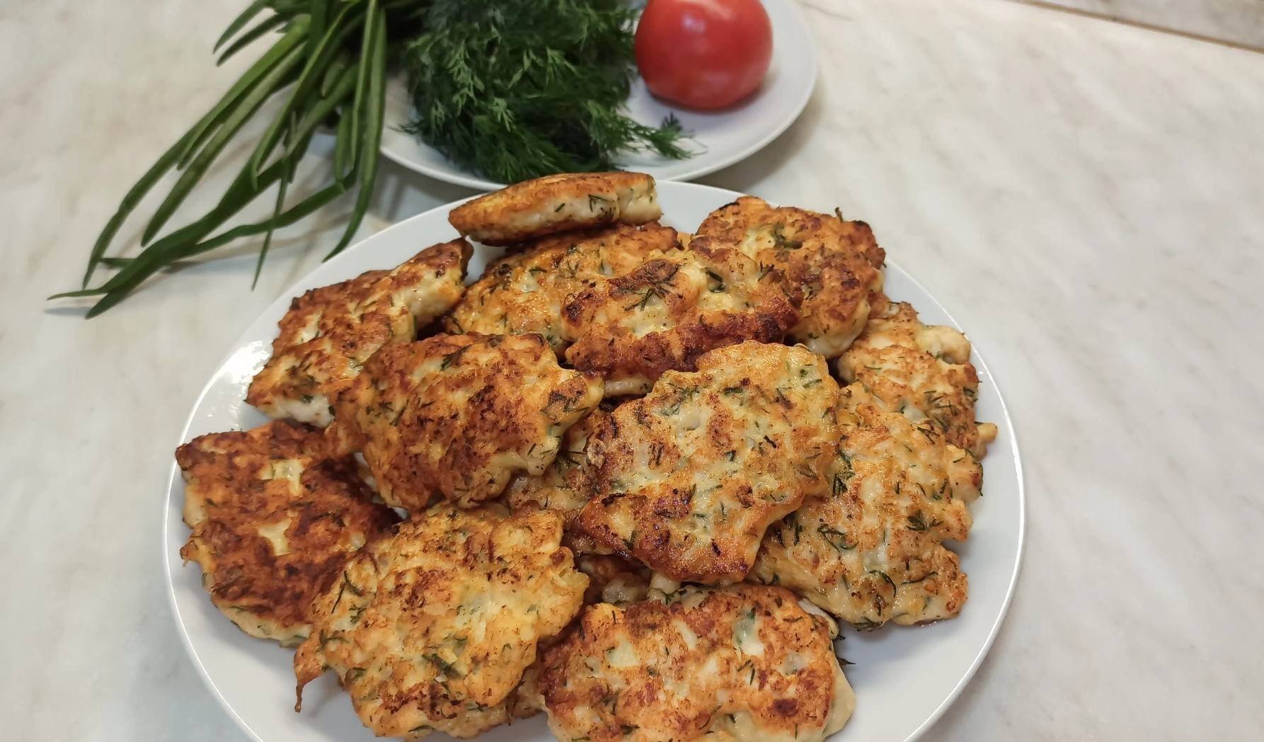 2. Далее всыпаем муку (крахмал) и зелень. Все хорошенько перемешиваем. Делаем лепешки и жарим до золотистой корочки (6-8 мин). Куриное филе не желательно долго готовить, может получиться очень сухим.