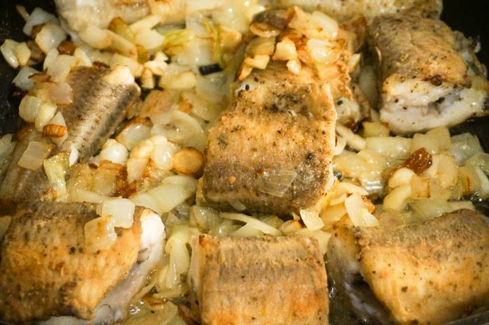 - Филе судака, обсушенное бумажным полотенцем, нарезать на кусочки средней величины, поперчить и посолить по вкусу.