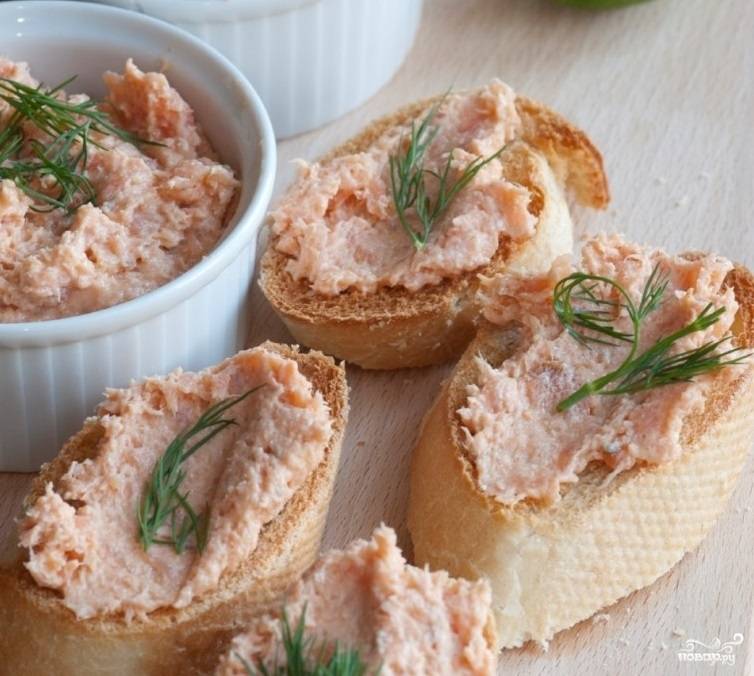 Еще один вариант – сделать маленькие бутерброды с паштетом из белого хлеба или батона. Украсить такой бутербродик можно дополнительно ломтиком лимона. Лимон очень хорошо сочетается с красной рыбой в любом виде, в том числе и с паштетом.