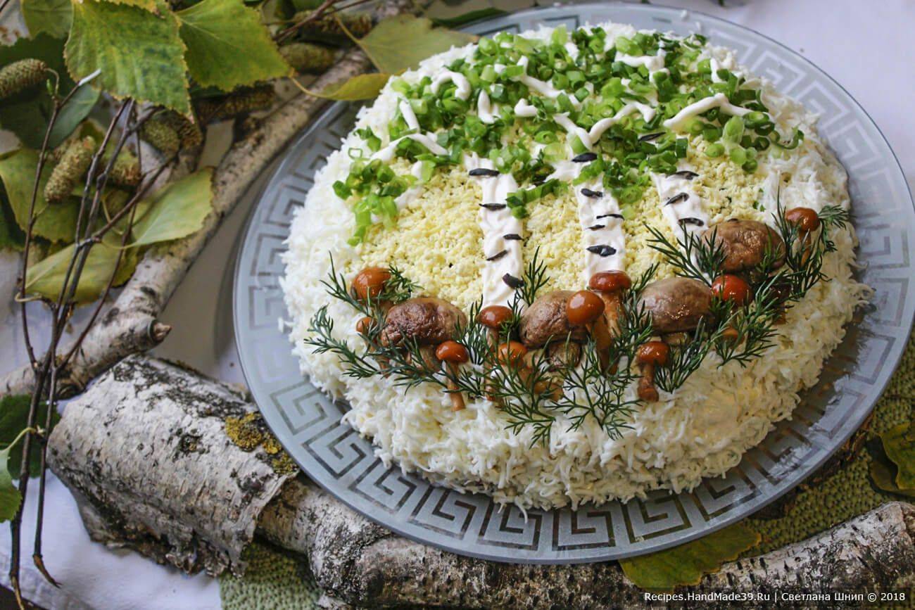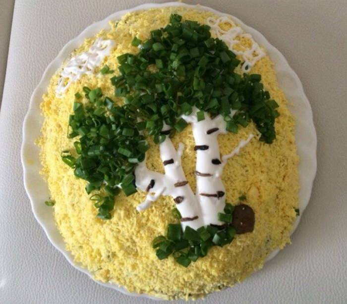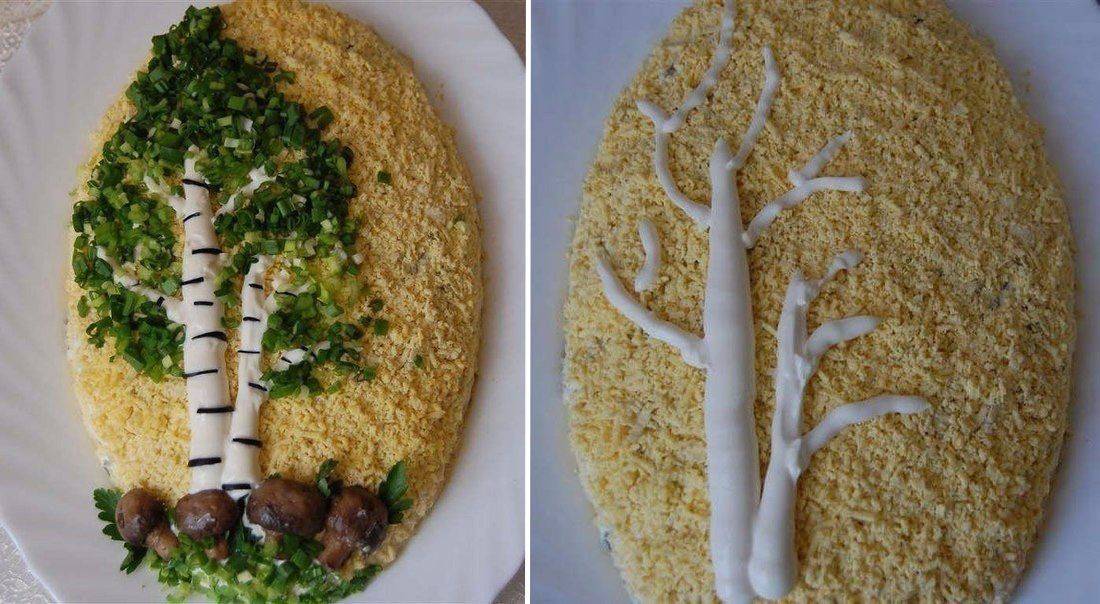 Обычно рецепты салата Березка представляют слоеный вариант. Потому что в таком виде блюдо выглядит более аккуратным, его легче украшать, выравнивать, придавать объем и форму. По желанию повара березку на поверхности создают либо в виде целого деревца со стволом и кроной, либо в виде ствола с черточками-черноливинами. Белый ствол при этом рисуют обычным майонезом, а крону — зеленым луком, свежим укропом или петрушкой.