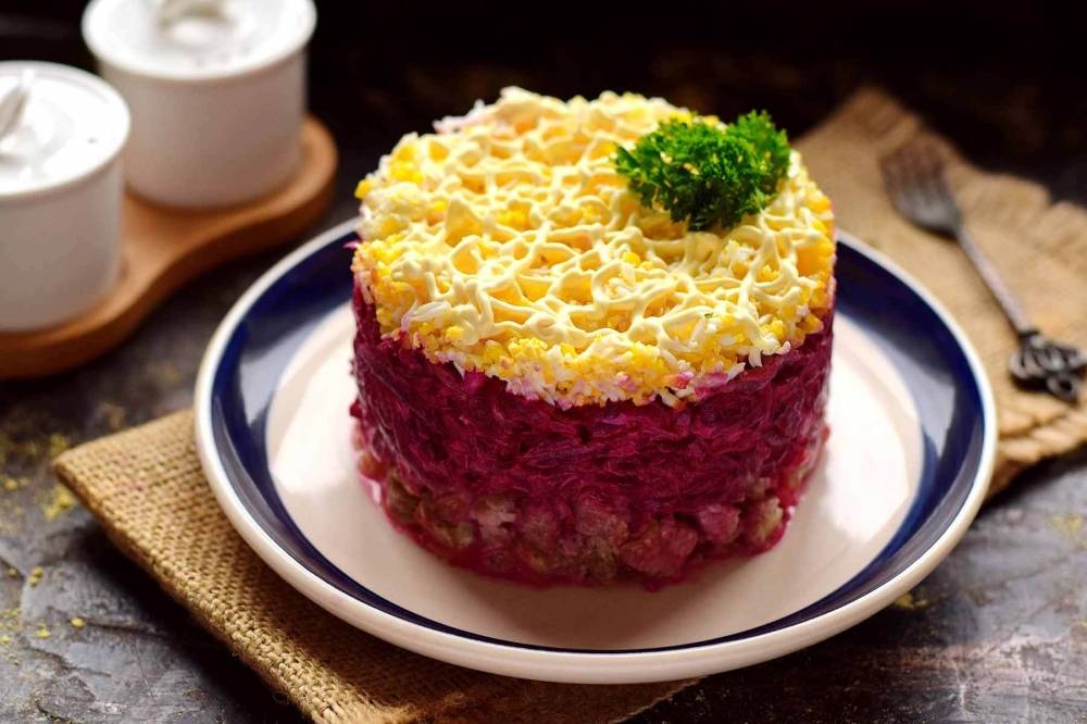 Еще один вариант подачи – на плоской тарелке, в виде цилиндра. Но в таком случае понадобится кулинарное кольцо или бортики от разъемной формы и ацетатная пленка, которая облегчит выемку салата. Поставить кольцо на тарелку, бортики изнутри обложить пленкой, заполнить салатом, слегка утрамбовывая слои. В таком виде поместить блюдо в холодильник. Через 5-8 часов, когда салат пропитается, снять кольцо и аккуратно удалить пленку.